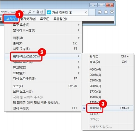 8. Internet Explorer 메뉴모음 > 보기 > 확대/축소 > 100%를 클릭
